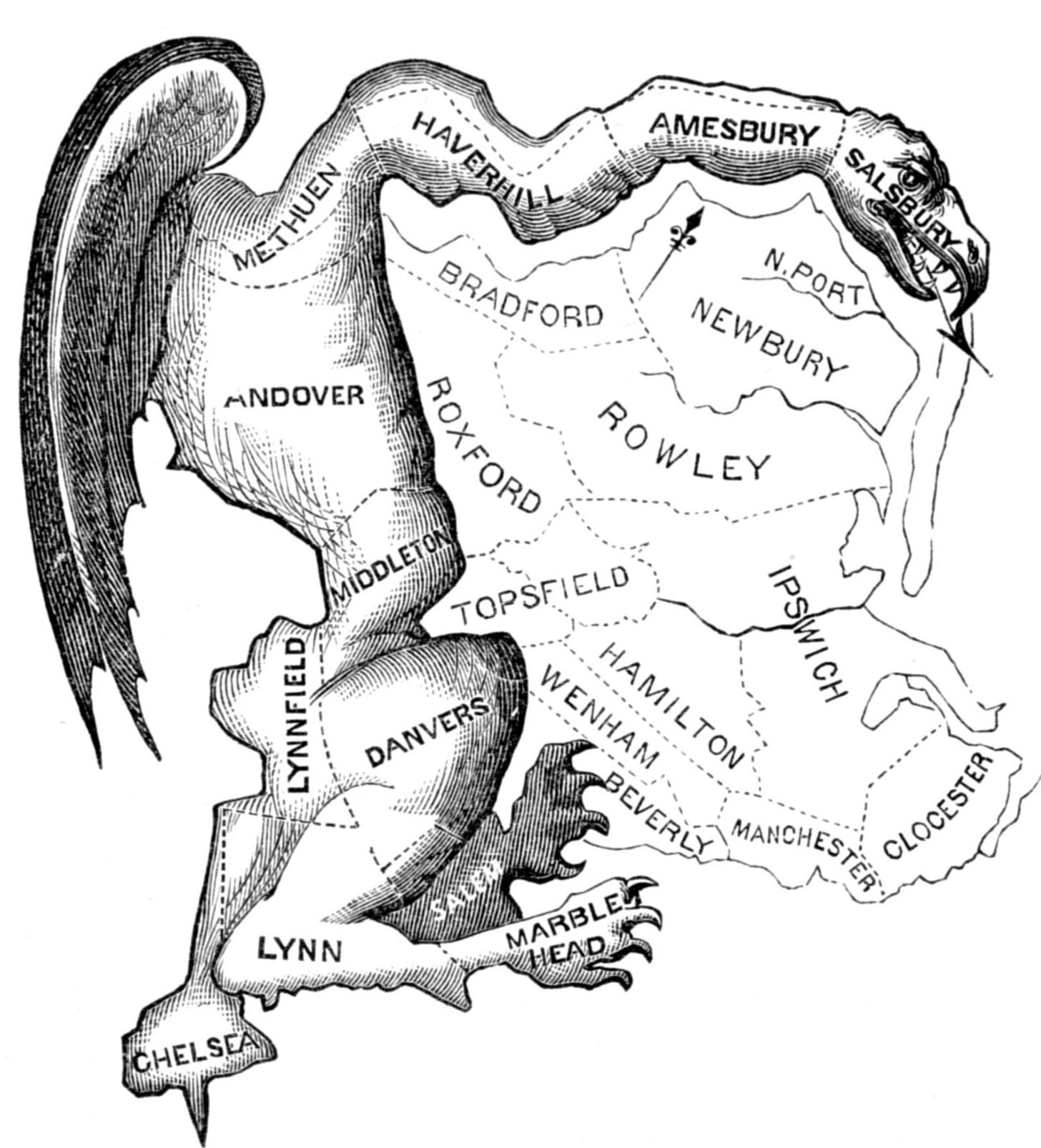 Image: A political cartoon from 1812, drawn by Elkanah Tisdale. It lampoons an oddly-shaped district drawn to favor Massachusetts Governor Elbridge Gerry’s Democratic-Republican party, giving rise to the term “gerrymander”. It is perhaps unfair that Gerry, generally highly respected by his revolutionary compatriots, and whose beliefs shifted between parties, became most well known for this partisan antidemocratic practice.